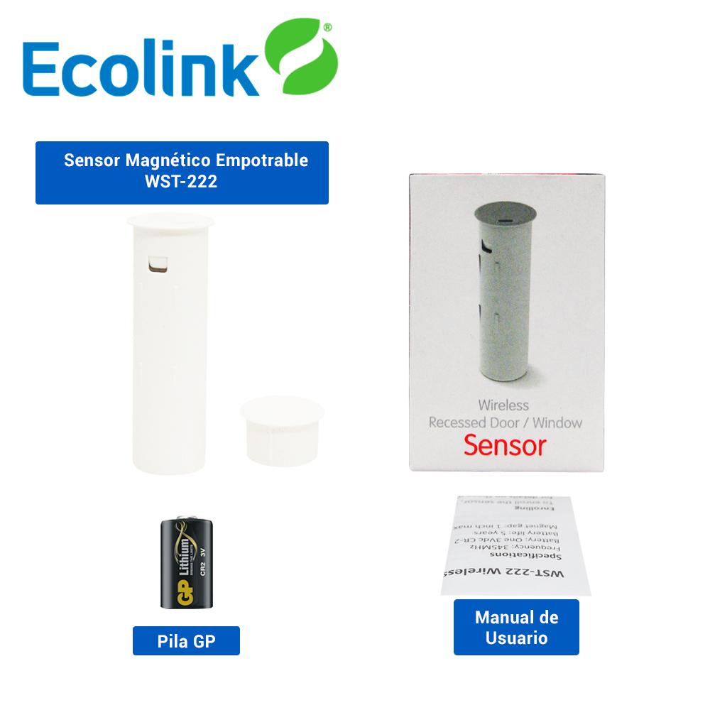 SENSOR MAGNETICO EMPOTRABLE EN PUERTA/VENTANA INALAMBRICO ECOLINK WST-222 Los contactos de la puerta están diseñados específicamente para uso en las puertas de acero comúnmente encontradas en edificios comerciales. El diseño único de la carcasa cuenta con un unibody resistente y la construcción con laterales acanalados flexibles para una instalación rápida y segura. Especificaciones Frecuencia: 345 MHz Temperatura de funcionamiento: 32 ° -120 ° F (0 ° -49 ° C) Batería: 3V de litio CR-2 Humedad de funcionamiento: 5-95% RH sin condensación Duración de la batería: 5 años Compatible con receptores Honeywell y 2GIG Espacio del imán: 1 pulgada máximo Intervalo de señal de supervisión : 60min (aprox.)