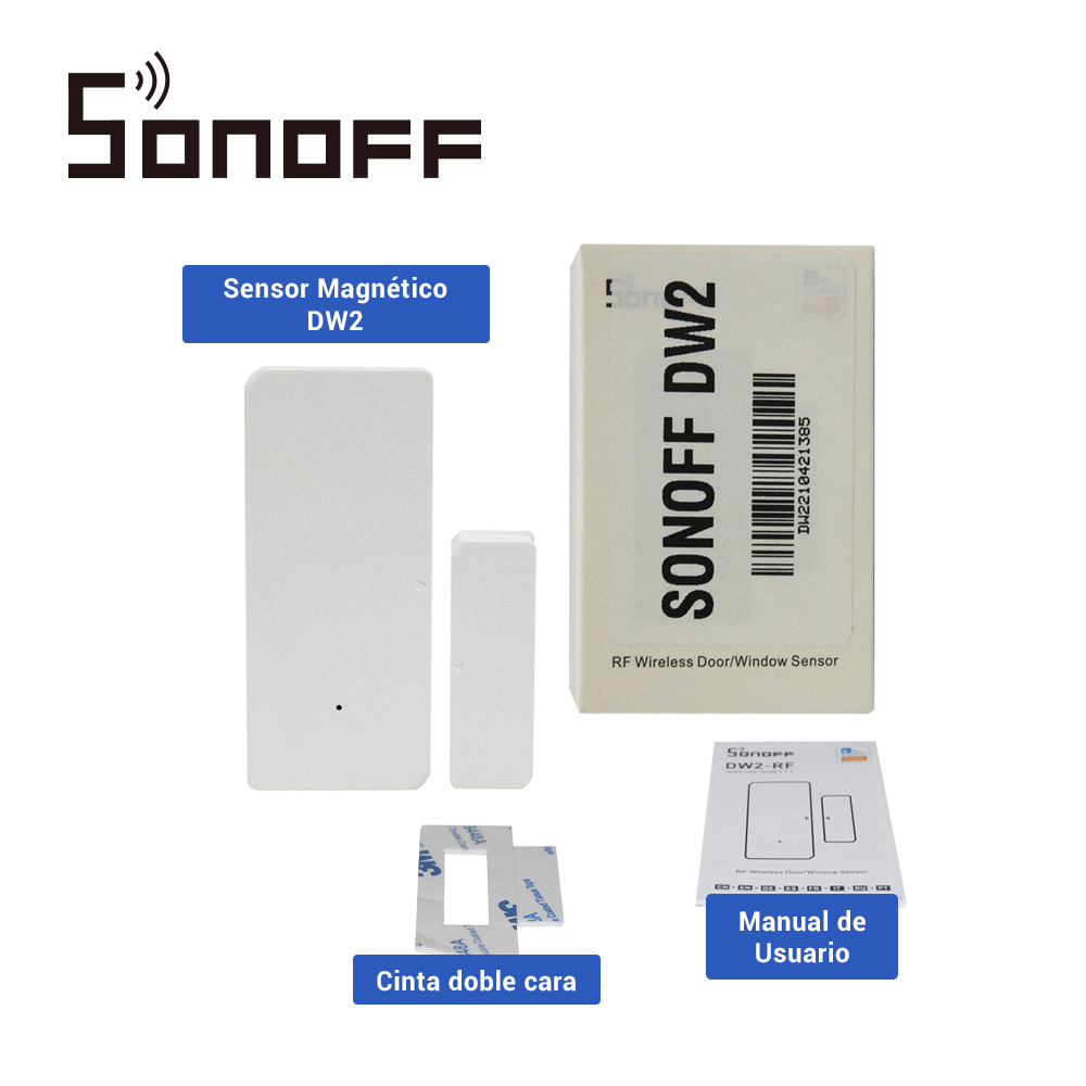 Sensor DW2 SONOFFDW2 es un sensor de alarma de puerta y ventana. Las alarmas de puerta funcionan con Sonoff RF Bridge 433. El sensor de alarma de puerta DW2 se enlaza con un Sonoff Bridge 433 y entonces detecta el estado de apertura e inmediatamente envía un mensaje de notificación de alarma a la aplicación eWelink.Microprocesador dedicado magnético de ultra baja potenciaAdmite una frecuencia inalámbrica de 433.92MHzDistancia de transmisión inalámbrica de 20 m (linea de vista)Antena incorporada proporcionadaMenos de 1 microampere corriente de reposo Tipo de batería requerida: 2 x AAA Frecuencia inalámbrica: 433.92MHz Protocolo: EV1527 Corriente de reposo: ¤6µA Corriente de emisión: ¤10mA Entorno de funcionamiento: -10°C -50°C Talla del producto: 70 x 32 x 19 mm Peso: 45g Compatible con equipo RF Bridge