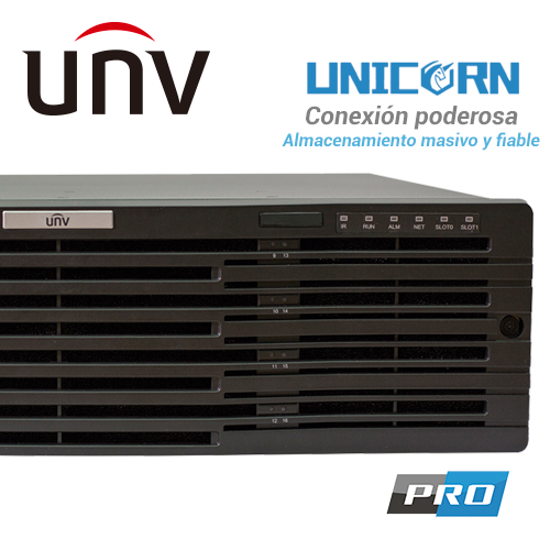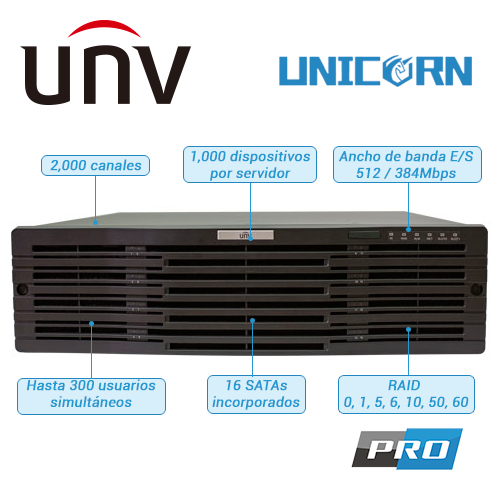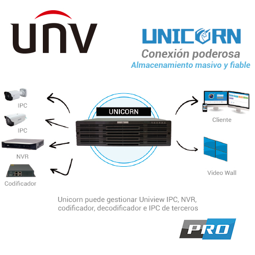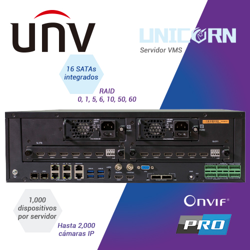 UNICORN UNIVIEW Unicorn es un servidor VMS central para proyectos de vídeo vigilancia de gran tamaño. Es una plataforma integrada de administración, almacenamiento, decodificación y visualización de dispositivos. Puede gestionar Uniview IPC, NVR, codificador, decodificador e IPC de terceros. Unicorn ofrece una solución fácil para aplicaciones como edificios, hoteles, parques industriales y cadenas de tiendas donde se requiere la centralización de vídeo. Estabilidad: sistema operativo Linux, BIOS dual, alimentación redundante. Compatibilidad: cámaras IP de terceros compatibles con ONVIF estándar. Acceso: navegador / servidor, cliente / servidor y clientes móviles (iOS y Android). Conexión: 1000 conexiones de dispositivos. Gestión: gestión unificada de NVR, IPC, codificador, decodificador, teclado de red, dispositivos en la nube, panel de control de alarma, configuración de dispositivos de soporte de importación / exportación. Almacenamiento: Máx. 16 discos duros y 2 gabinetes de discos; ampliable hasta 48 discos con almacenamiento de 384TB. Decodificación: salidas máximas de decodificación de 16 a 1080P en tres pantallas, ampliables hasta 112 a 1080P en 15 pantallas con 2 tarjetas de decodificación insertadas Servicio: vista en vivo, reproducción, secuencia, video wall, E-map, audio bidireccional y plan de alarma. VCA: Soporte para recibir alarmas de VCA, configurar operaciones de enlace de alarmas y mostrar estadísticas de recuento de personas en informes. Fiabilidad: Soporte de HTTPS, autenticación 802.1x, protección ARP, habilitación / deshabilitación de Telnet, tolerancia a fallas de red, configuración multi-IP y balanceo de carga.
