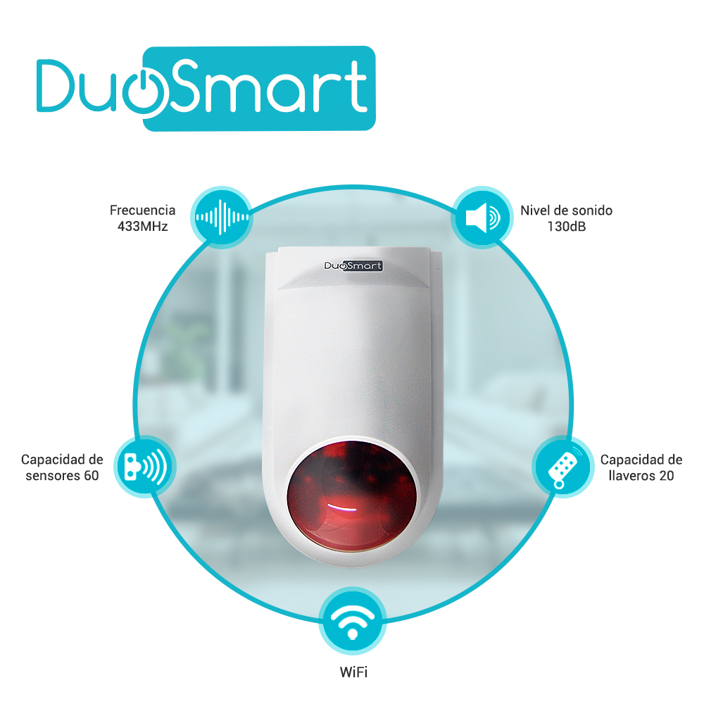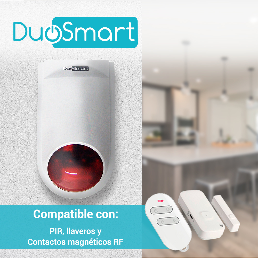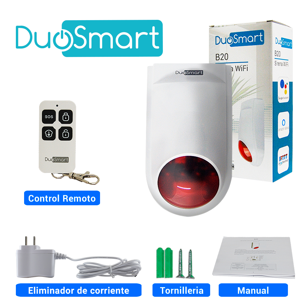 SIRENA/PANEL INTELIGENTE WIFI DUOSMART B20 La sirena autónoma B20, es un sistema de alarma que puede conectarse directamente a WiFi y ser monitoreada por ti directamente en tu APP Duosmart. Incluye un control remoto y es compatible con hasta 20 controles RF 433.92 También acepta dispositivos PIR, sensores magnéticos y otros sensores con tecnología RF de 433.92 MHz donde podemos agregar hasta 60 de estos y agregarlos conforme a las necesidades que tengas con la siguiente configuración: Perimetrales, tu sirena se alarma cuando esta armada en modo total o parcial y alguno de estos dispositivos cambia de estado Interiores, tu sirena se alarma solo cuando cambian de estado estos dispositivos pero solo en armado total, en modo parcial (stay) no activarán la sirena. 24 horas audible, sus dispositivos agregados harán que la sirena se active en todo momento aunque la sirena este en modo desarmado. Desde tu celular con al APP, arma, desarma y pide auxilio de forma remota, o hazlo con el control remoto incluído en la caja. Ejecuta escenas con otros dispositivos para hacer más robusta tu solución de seguridad, haz que las luces de tu casa se enciendan cuando la sirena este sonando por ejemplo; esta y practicamente cualquier interacción con los dispositivos inteligentes de Duosmart es posible. Como verás, la sirena B20 es un complemento perfecto que Duosmart tiene para ti. Características Alimentación de 9 volts a 600mA por medio por medio de un eliminador incluído WiFi 2.4 GHz RF 433.92 MHz código fijo Tamper de seguridad Sonido de alarma 130dB Compatible con escenas para interactuar con otros dispositivos inteligentes Duosmart