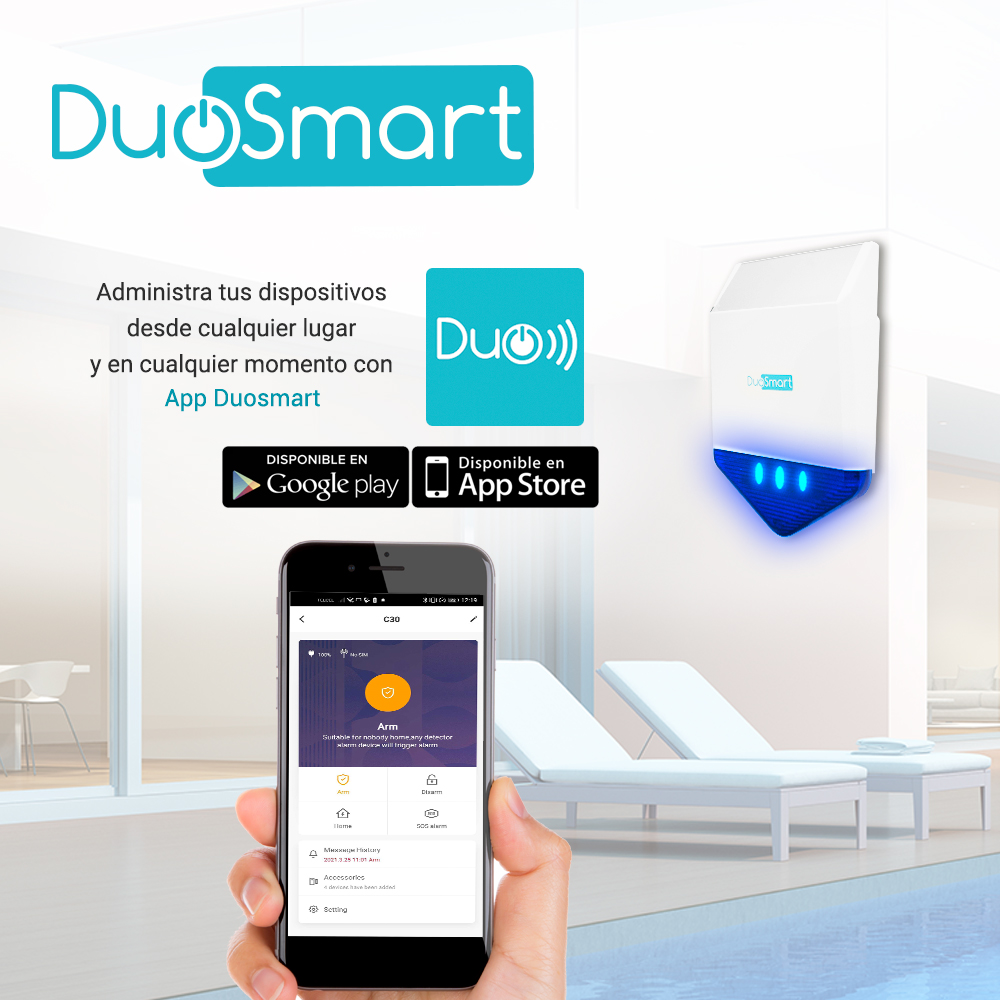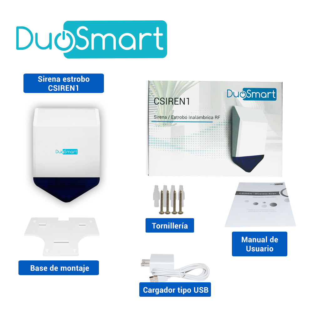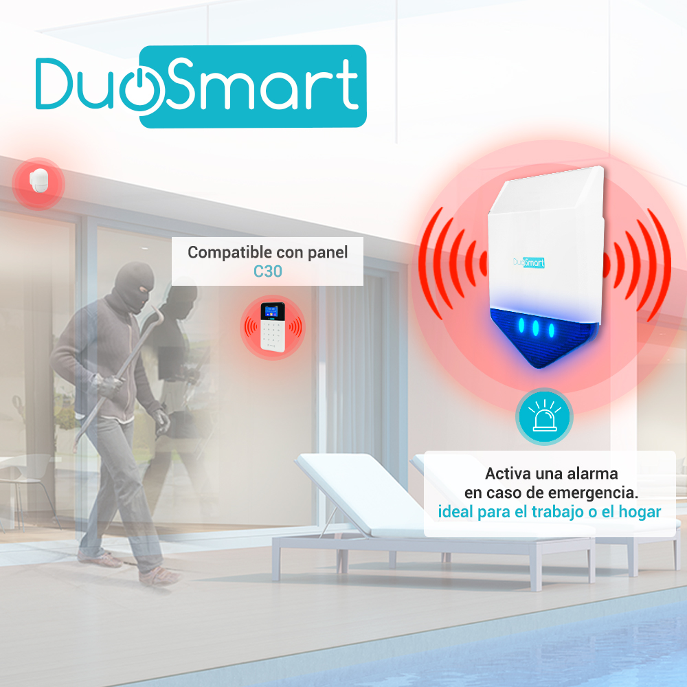 Sirena/estrobo inalámbrica RF Duosmart -CSIREN1 *Compatible solo panel C30* Csiren1 es una sirena inalámbrica por RF compatible con el panel C30 para usar sus funciones de activación y desactivación Cuenta con destelladores led de manera que obtendrá un anuncio audiovisual en caso de activación. Caracteristicas Alarma anti-tamper para sabotaje 4 niveles de volumen Nivel de sonido 110 dB 4 diferentes tipos de alerta Corriente de operación: 1A Frecuencia de operación: 433.92 MHz Batería de respaldo Leds indicadores