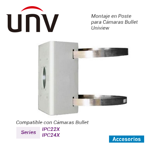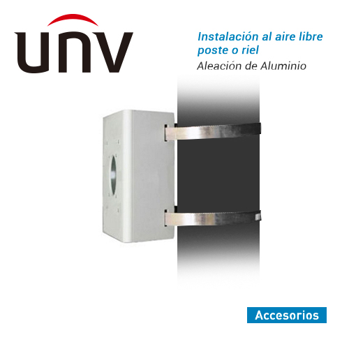 Descripción Descripción TR-UP06-B-IN UNIVIEW Montaje para poste compatible con series IPC22X y IPC2AX, IPC23XX, IPC74X, IPC252, 26X Dimensiones: 99mm x 90mm x 38mm (3.9"x3.5"x1.5") (L, W, H) Peso: 0.2kg(0.44lb) Material Aluminio y metalDocumentosFicha técnica