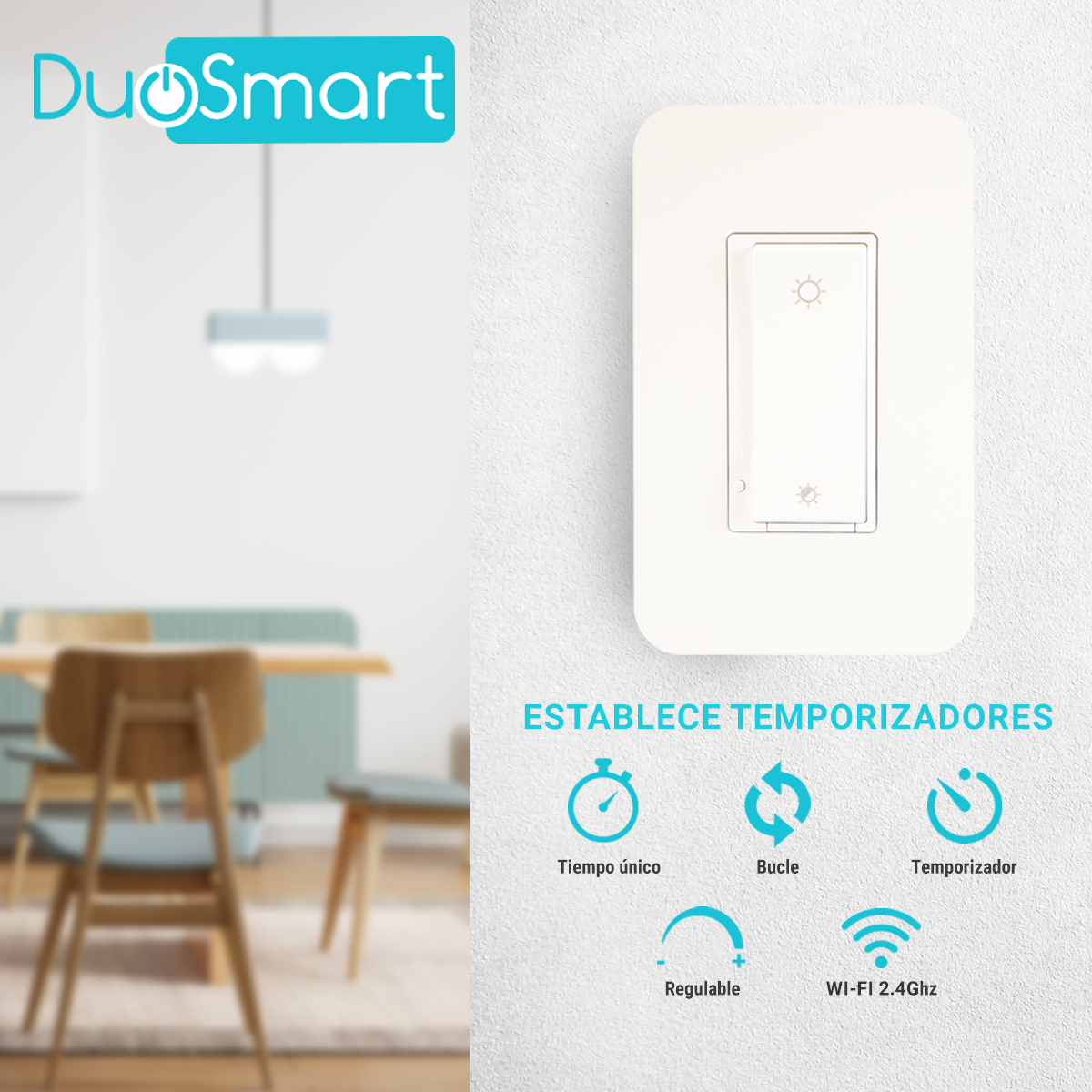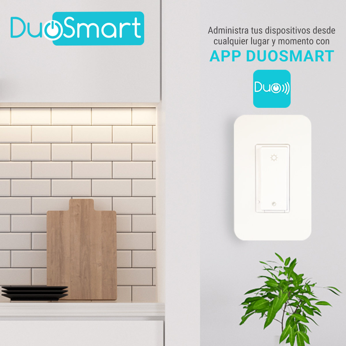 Switch apagador Apagador inteligente con control de intensidad Duosmart A50 Controla tu luminaria dimeable gracias al control por fase de DUOSMART modelo A50 que te permite tener el control de la intensidad de iluminación desde cualquier parte gracias a su conexión Wifi 2.4GHZSi estás leyendo, haciendo ejercicio he incluso si tus hijos duermen puedes controlar la iluminación de cada habitación desde tu teléfono inteligente con la APP DUOSMART.Genera escenas y crea el ambiente perfecto para cada una de tus actividades y con la iluminación adecuada para cada momento del día **requiere cable neutro, compatible con WIFI de 2.4GHz. Características Protección contra sobrecarga Control electrónico de iluninación máxima y minima Temporizadores programables Compatible con escenas de automatización Encendido y apagado con control tipo touch Control completo con app Duosmart Especificaciones Voltaje de operación 100 - 250 VCA Potencia de carga de hasta 500 watts en lámparas incandescentes Potencia de carda de hasta 150 watts en focos y lámparas tipo led (deben ser dimmeables para poder regular la intensidad) Requiere cable neutro Frecuencia de operación (red) 2.4 GHz Estandar inalámbrico IEE802.11 b/g/n Temperatura de operación -20° C - 75°C Medidas 125 x 80 x 420 mm