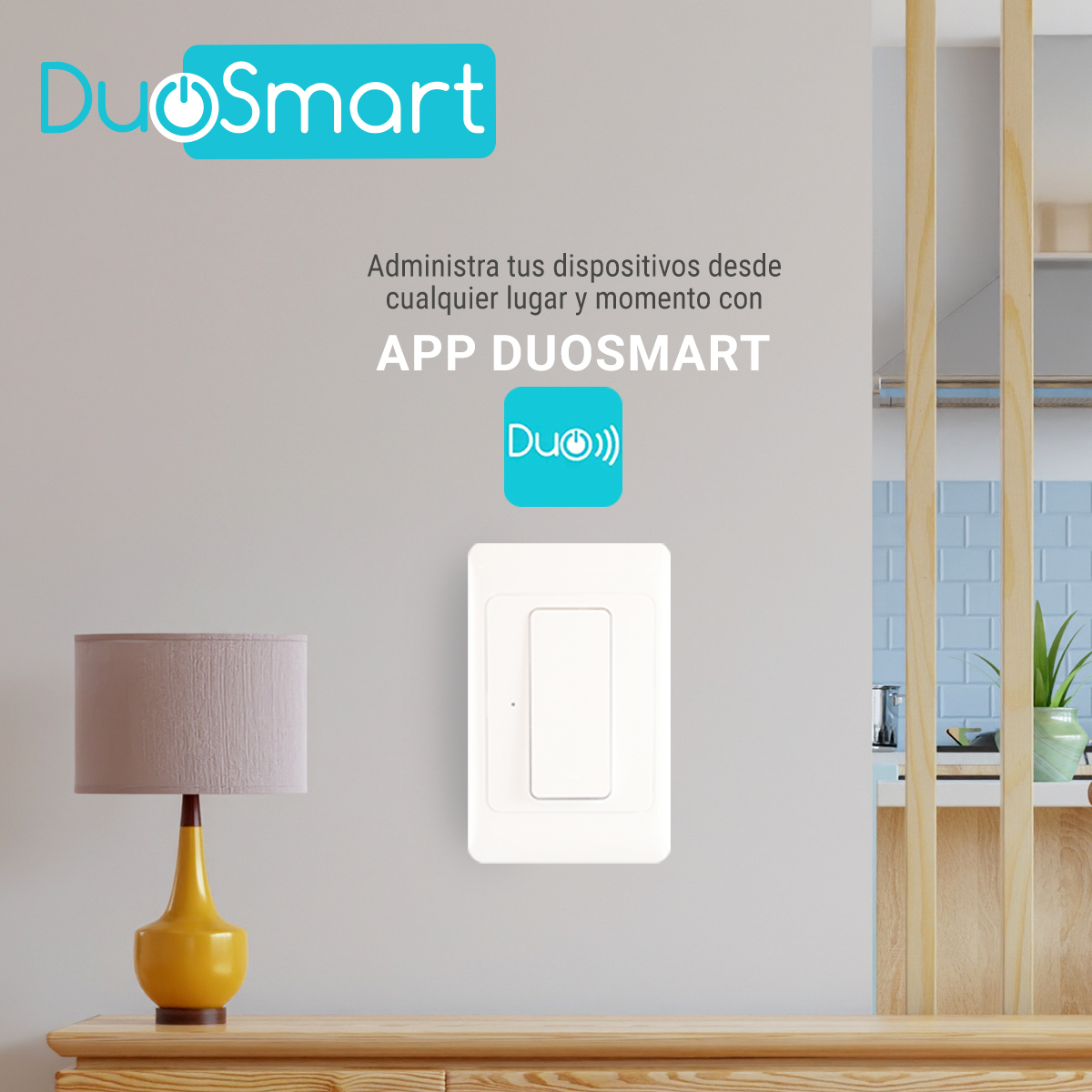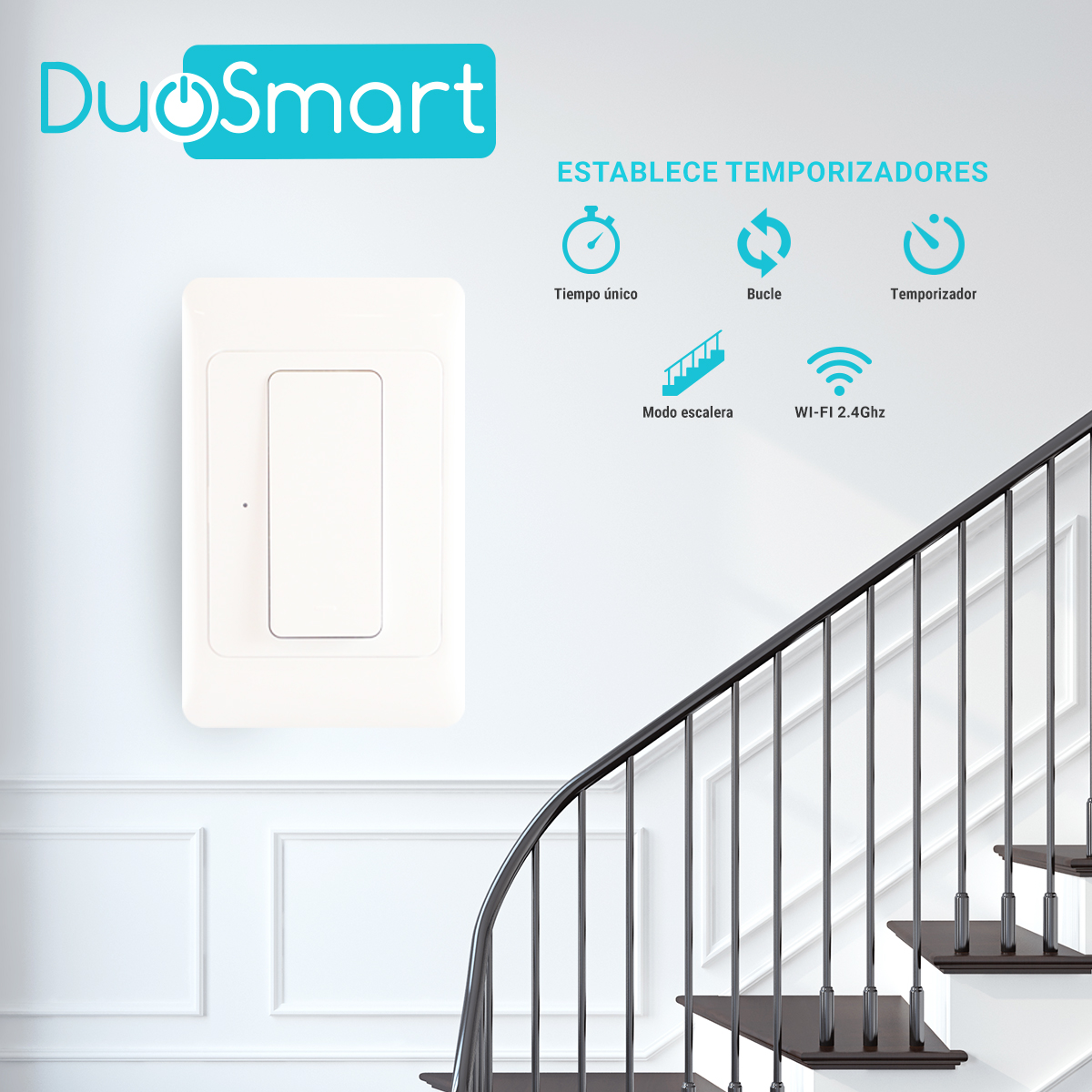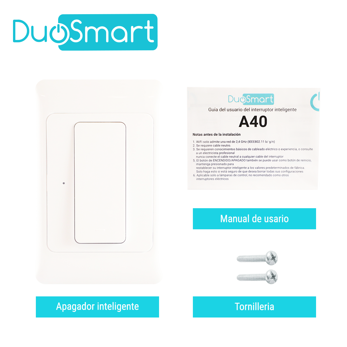 Switch apagador inteligente de escalera WIFI DUOSMART A40 1 unidad Controla tus luminarias en el hogar, el modelo A40 te permite controlar una luminaria y utilizar la configuración de escalera dando como ventaja el controlar la iluminación en 2 puntos distintos además de mantener el control desde tu APP Duosmart. Este modelo es el sustituto ideal de tus apagadores de escalera convencionales, a diferencia de las escenas creadas con apagadores inteligentes; el A40 puede seguir operando en modo escalera incluso cuando no tienes internet por alguna desconexión gracias a su conexión cableada Si así lo requieres puedes utilizarlo como un interruptor inteligente. Gracias a su configuración de carga simple, el modelo A40 se adapta a tus necesidades. **Requiere de conexión de cable neutral, compatible con WIFI de 2.4GHz. Características Protección contra sobrecarga Temporizadores programables Compatible con escenas de automatización Encendido y apagado en 2 sitios para mayor comodidad Control completo con app Duosmart Especificaciones Voltaje de operación 100 - 250 VCA Potencia de carga de hasta 500 watts en lámparas incandescentes Potencia de carga de hasta 150 watts en focos y lámparas tipo led Requiere cable neutro Frecuencia de operación (red) 2.4 GHz Estandar inalámbrico IEE802.11 b/g/n Temperatura de operación -20° C - 75°C Medidas 125 x 80 x 420 mm