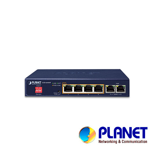 SWITCH NO ADMINISTRABLE / PLANET GSD-604HP / 6 PUERTOS RJ45 10/100/1000 MBPS / 4 PUERTOS POE 802.3AT/AF (PUERTOS 1 – 4) / SIN VENTILADOR / 67W DE CONSUMO / RECINTO DE METAL / DIP SWITCH (VLAN, ESTANDAR Y EXTENDIDO).