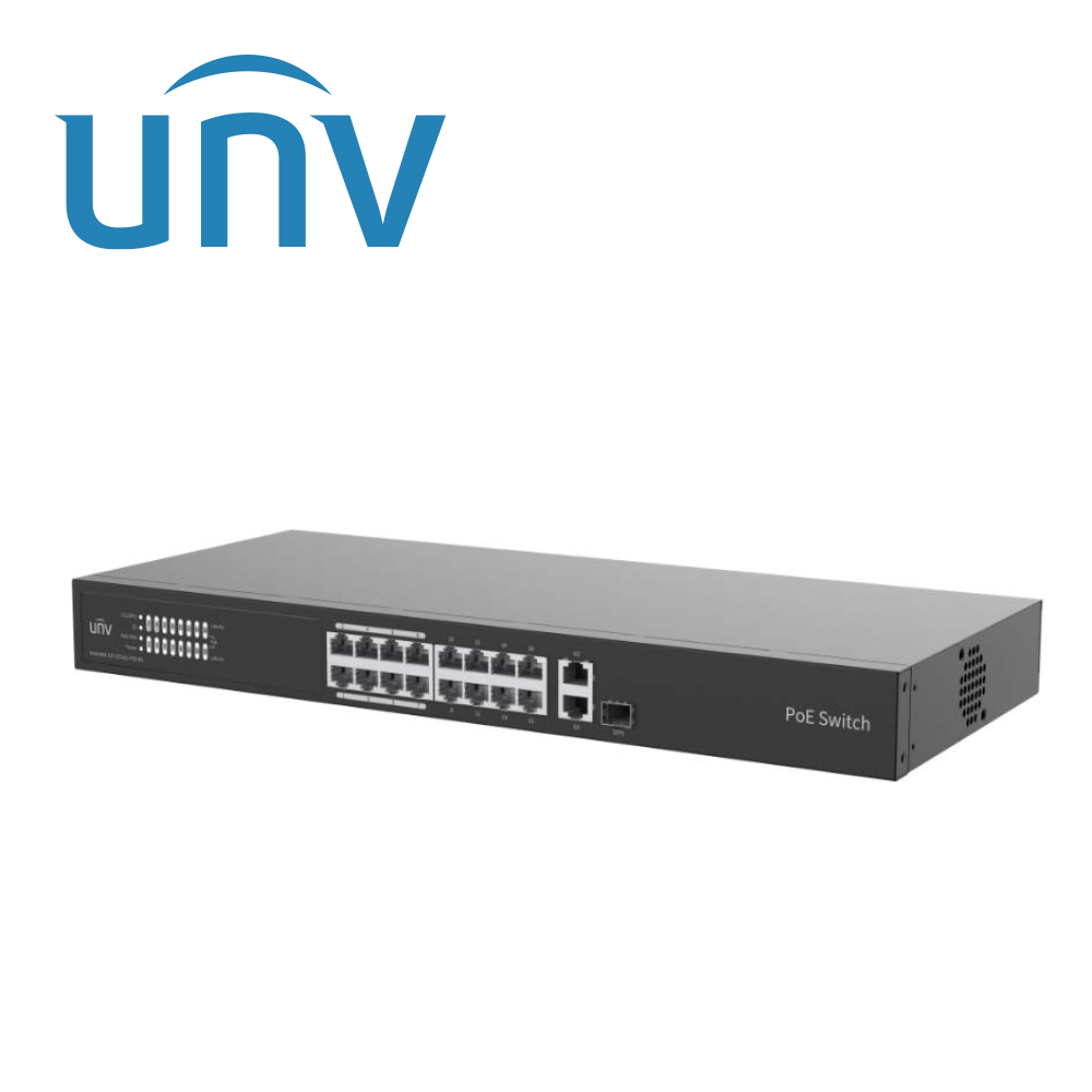 SWITCH POE 16 CLOUD MANAGEMENT ETHERNET UNV NSW3000-16T1GT1GC-POE-IN / 16 x 10/100 Mbps POE (RJ45) 1 GIGABIT PORT(RJ45) 1 GIGABIT COMBO / POTENCIA MÁXIMA: 165 W / ADMINISTRACIÓN DE PUERTOS REMOTOS La serie de switches Ethernet de baja potencia PoE NSW3000 es un switch gestionado en la nube desarrollado por Uniview con alto rendimiento, fácil de usar y mantener. Proporciona una configuración básica de red de 2 capas ligera, que incluye espejado de puertos, anti-bucle de puertos, VLAN, agregación de enlaces, control de flujo, etc. Soporta el descubrimiento automático de dispositivos de video conectados y la generación de topología de red; soporta la gestión y configuración unificada en el software para un mantenimiento rápido de múltiples dispositivos; y soporta la visualización del estado del dispositivo y la gestión de dispositivos en la Web o en la aplicación. El switch cumple con los requisitos del usuario para acceder a la red con alta fiabilidad y bajo costo, siendo ampliamente utilizado en escenarios como tiendas, supermercados, empresas, campus, etc.