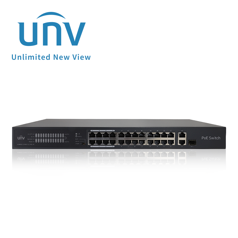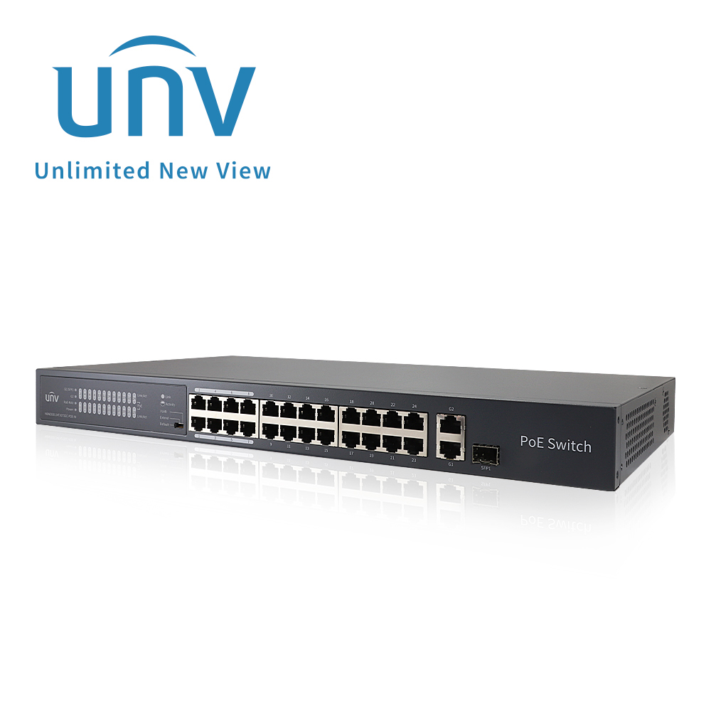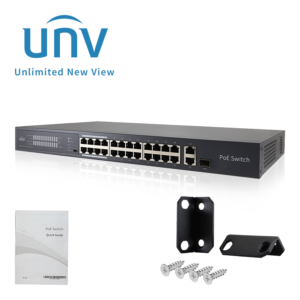 SWITCH POE UNIVIEW NSW2020-24T1GT1GC-POE-IN Especificaciones: 24 puertos 10/100 fast PoE; 1 puerto 10/100/1000 Giga ; 1 puerto 10/100/1000 Combo. Múltiples modos de trabajo para satisfacer las necesidades de su negocio: normal, seguro y vigilancia. Soporte de control de tráfico por por puerto. Compatibilidad con el modo seguro, todos los puertos de enlace descendente pueden comunicarse solo con los puertos de enlace ascendente Hasta 250 m de distancia de transmisión en modo vigilancia. (Solo para cámaras UNV) Soporte de optimización de búfer Carcasa totalmente metálica, segura y fiable. Capacidad máxima: 370 W. Capacidad máxima por puerto: 30 W.