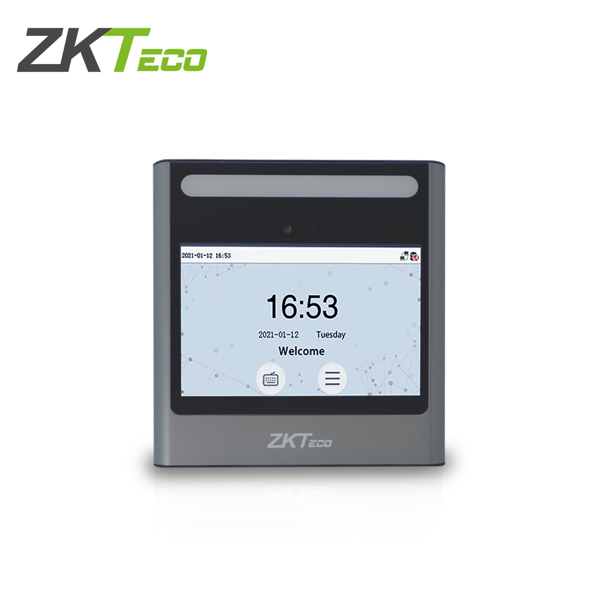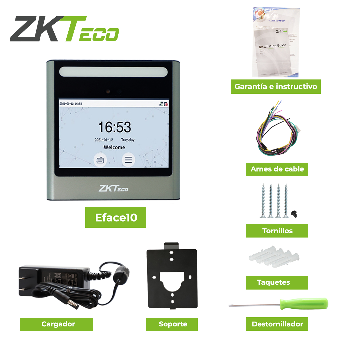 Terminal de asistencia con control de acceso y reconocimiento facial EFACE10 de ZKTeco EFace10 es una terminal de identificación facial sin contacto que presenta la innovadora tecnología de reconocimiento facial visible light ZKTeco.Con el último algoritmo y tecnología de reconocimiento facial visible light, el dispositivo realizará automáticamente el reconocimiento de un objetivo a larga distancia cuando detecte un rostro humano en la distancia de detección para ofrecer una mejor calidad de reconocimiento en términos de velocidad y precisión que el anterior. Terminales de reconocimiento facial por infrarrojos. Software de Administracion Gratuito: ZKBio CVAccess.