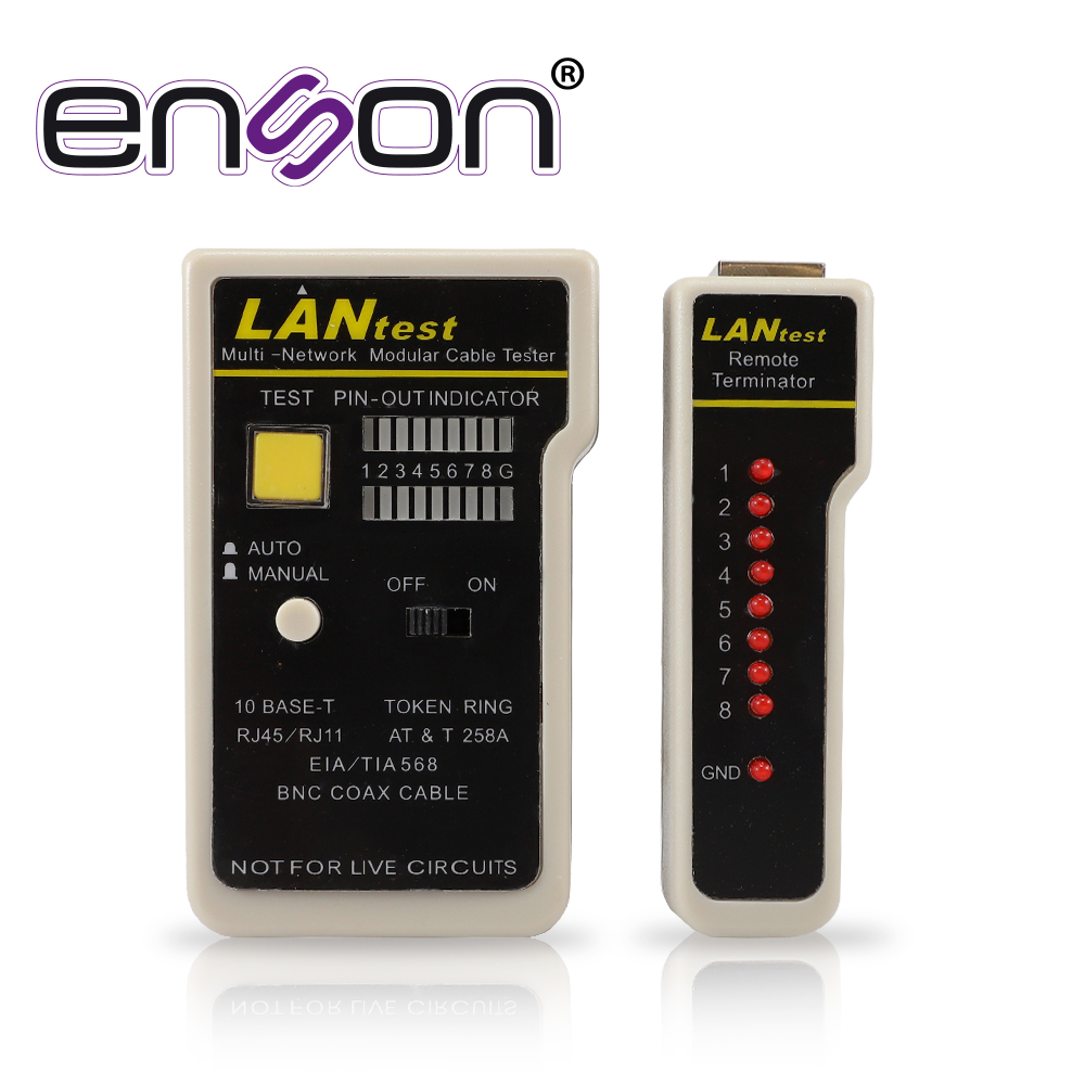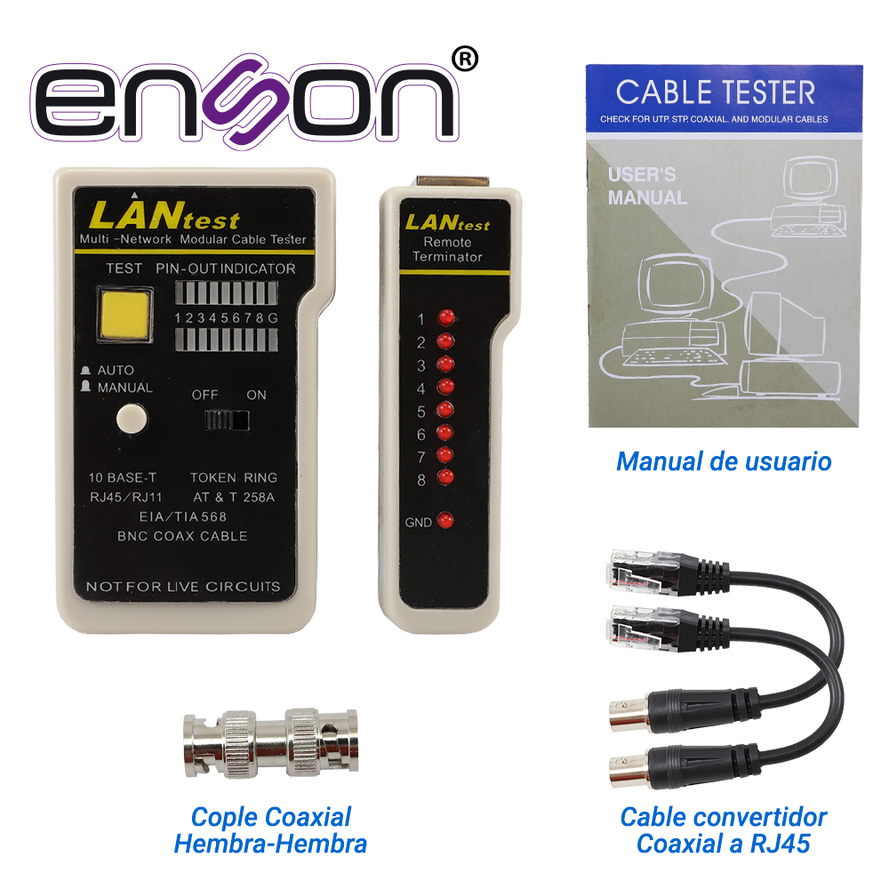 ENS-TELN2 ENSON Probador de cable UTP. Acepta conectores RJ11 y RJ45. Realiza pruebas de continuidad del cable UTP por hilo. Capaz de realizar pruebas de continuidad de cable en coaxial BNC. Prueba de par abierto/cruzado. NO INCLUYE BATERIA BATERIA RECOMENDADA: PILA ALCALINA 9 V