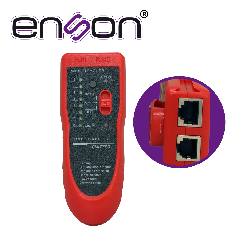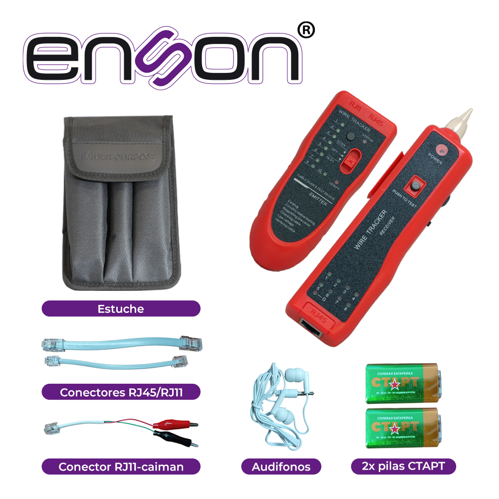ENS-TS02 ENSONGenerador de tonos para identificar cables de red o telefónicos. Se utiliza para seguir un determinado cable en una instalación, conectando el transmisor en una punta del cable y al acercar el generador de tonos al cable, en cualquier punto de su camino, emitirá una señal audible, identificándolo. Incluye audífonos cables probadores baterías más estuche.