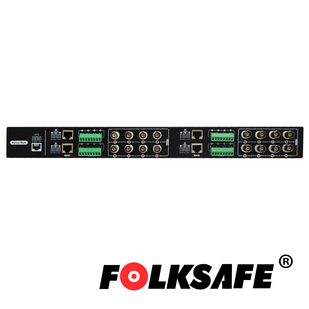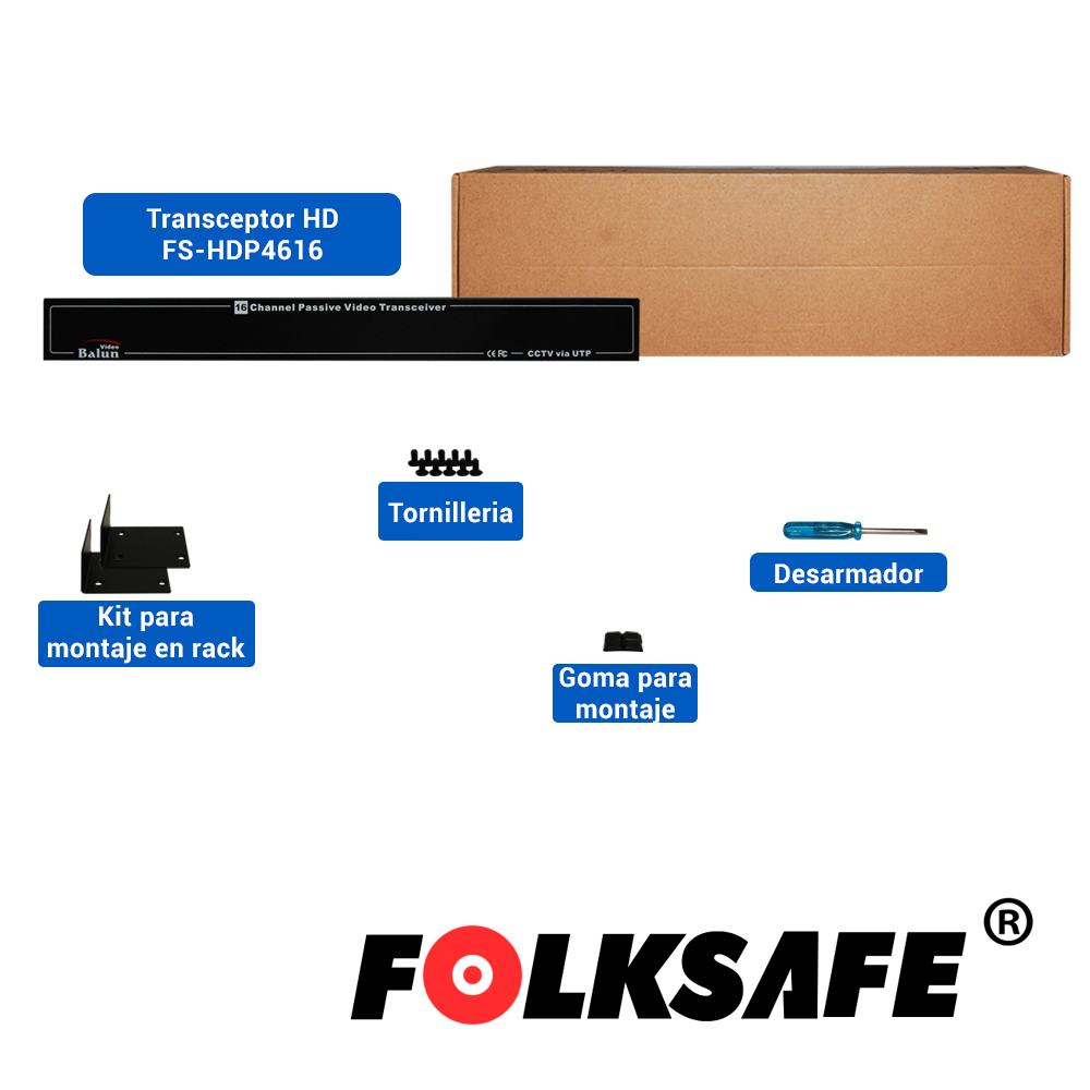 Transceptor de 16 Canales Video Pasivo Folksafe FS-HDP4616 Transceptor FS-HDP4616 es un dispositivo pasivo de 16 canales que permite la transmisión de señales de video CCTV HD en tiempo real a través de un cable de par trenzado sin blindaje (UTP), es compatible con los transceptores FS-HDP4100C y FS-HDP4101C para compatibilidad con todas las cámaras analógicas HD-TVI, HD-CVI, AHD y CVBS, cuenta con terminales de tornillo para cables UTP y conexiones RJ45, cuenta con un supresor de sobretensiones incorporado para proteger el equipo de video contra picos de voltaje dañinos y proporcionar inmunidad al ruido.